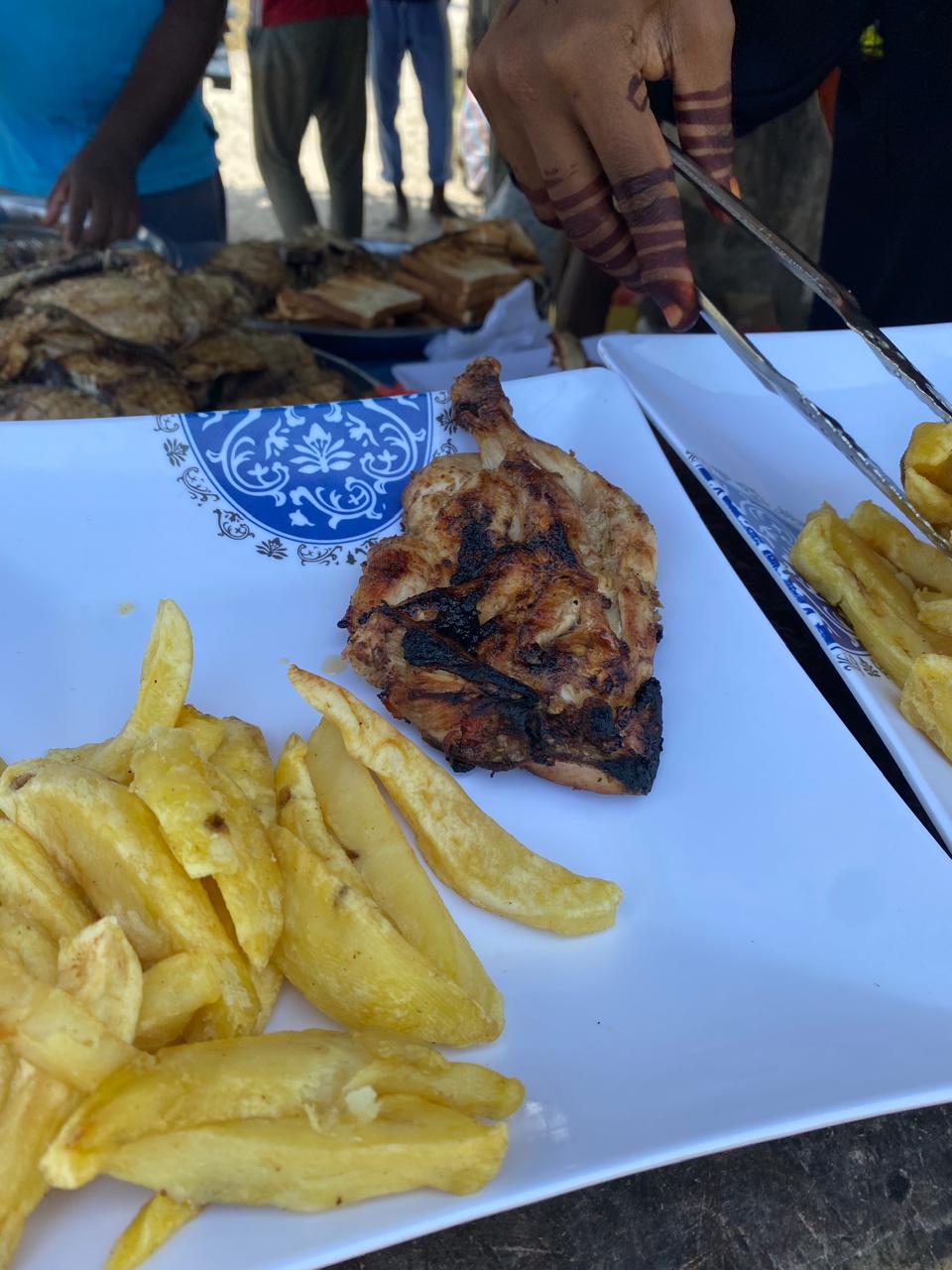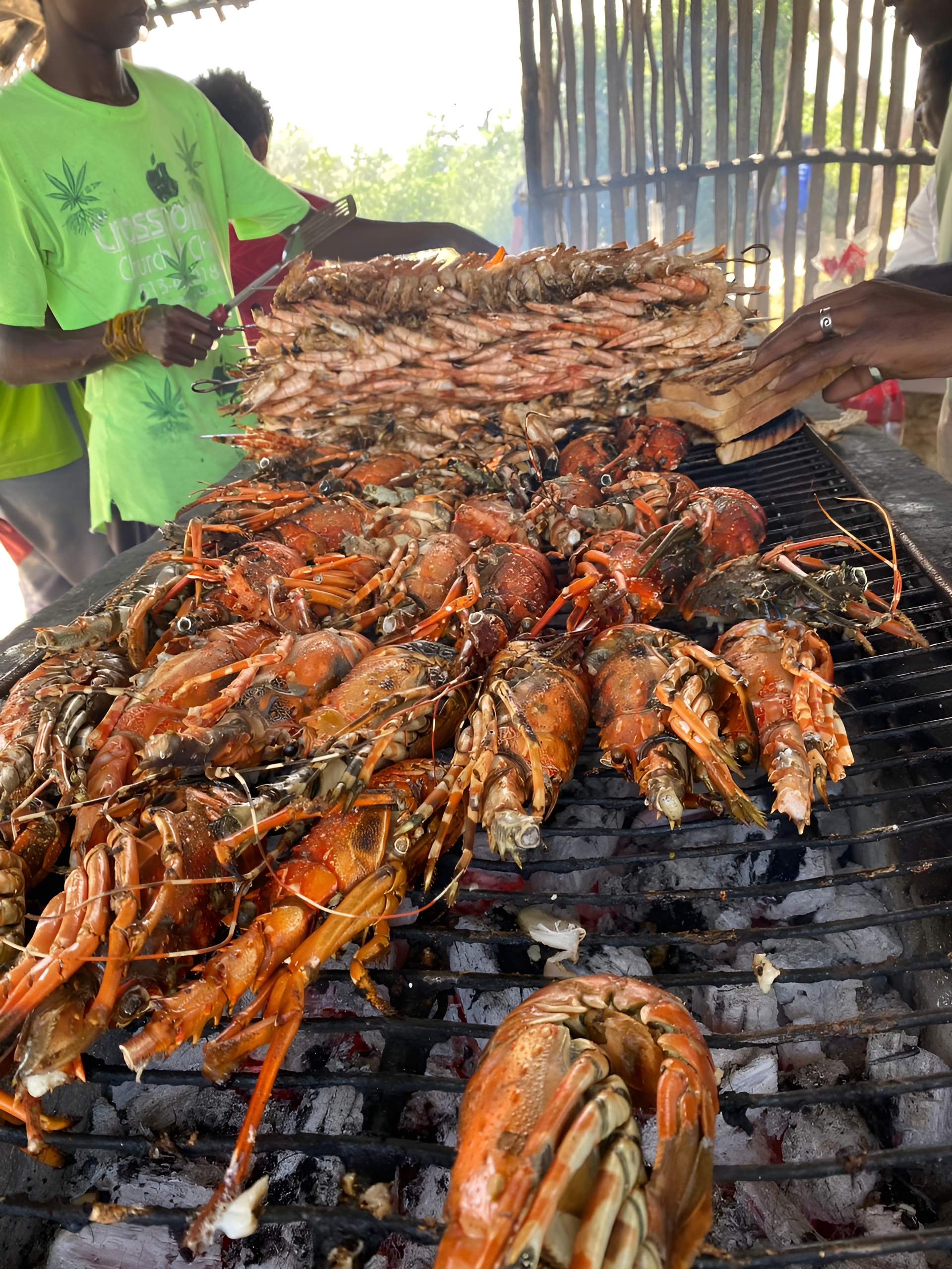 Pranzo completo con aragosta, pesce alla griglia, gamberi, riso al cocco con sugo di polpo, frutta tropicale e bevande rinfrescanti